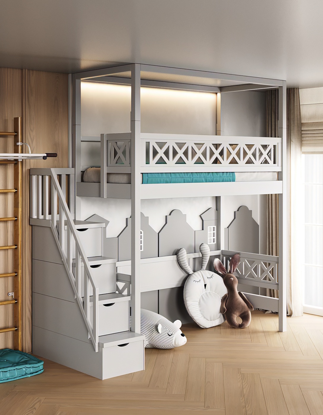 Удобная лестница-комод. Доступ к спальному месту обеспечивает удобная и безопасная лестница, которая одновременно служит комодом. В выдвижных ящиках можно хранить игрушки, книги, одежду и другие вещи. Это помогает поддерживать порядок в комнате и учит ребёнка организованности.